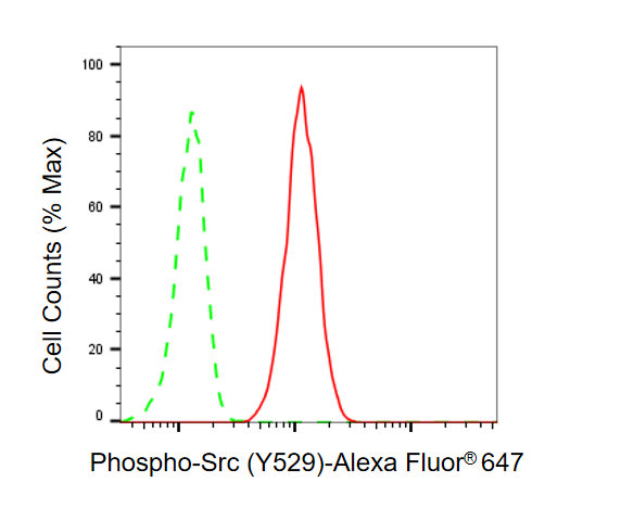Flow cytometric analysis of phospho-Src (Y529) expression in C2C12 cells using phospho-Src (Y529) antibody. Green, isotype control; red, phospho-Src (Y529).