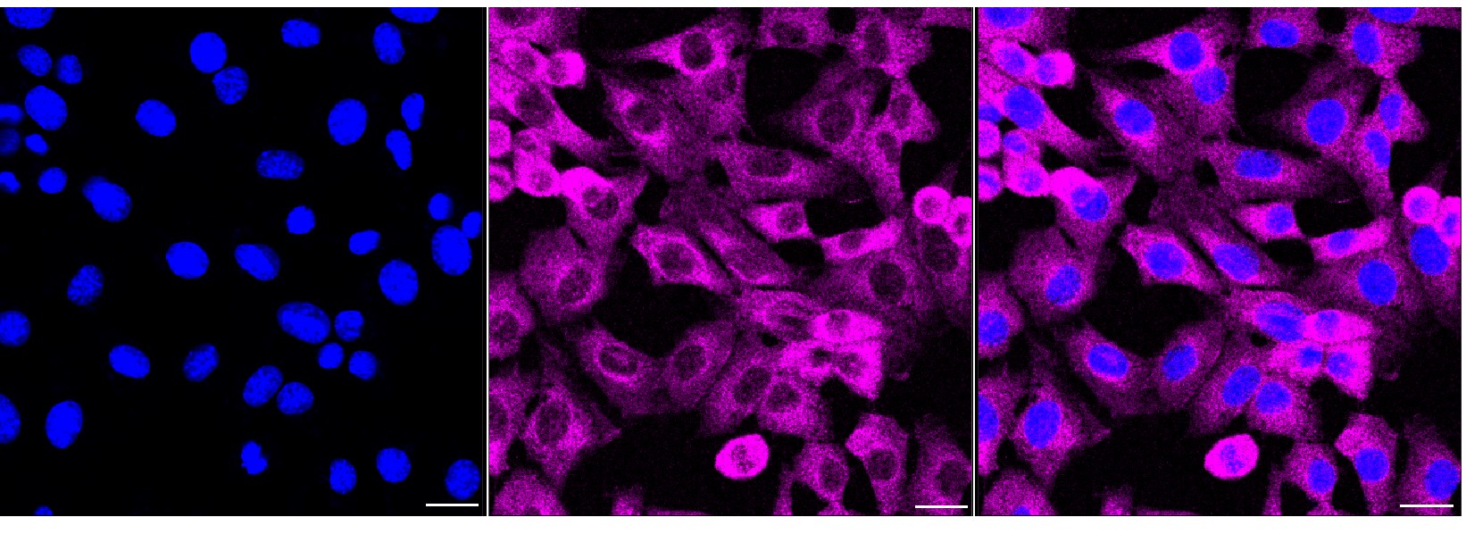 Immunocytochemical staining of C2C12 cells with Phospho-Src (Y529) antibody. Nuclei were stained blue with DAPI; Phospho-Src (Y529) was stained magenta with Alexa Fluor? 647. Images were taken using Leica stellaris 5. Protein abundance based on laser Intensity and smart gain: Medium. Scale bar, 20 μm.