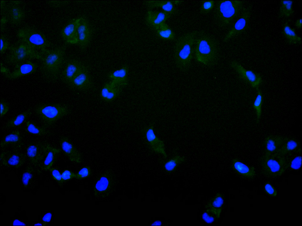 Immunofluorescence staining of HeLa cell with CSB-RA921465A0HU at 1:50 , counter-stained with DAPI. The cells were fixed in 4% formaldehyde, permeabilized using 0.2% Triton X-100 and blocked in 10% normal Goat Serum. The cells were then incubated with the antibody overnight at 4°C. The secondary antibody was Alexa Fluor 488-congugated AffiniPure Goat Anti-Rabbit IgG(H+L).