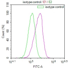 Overlay Peak curve showing HepG2 cells stained with CSB-RA945827A0HU (red line) at 1:100. The cells were fixed in 4% formaldehyde and permeated by 0.2% TritonX-100. Then 10% normal goat serum to block non-specific protein-protein interactions followed by the antibody (1ug/1*106cells) for 45min at 4℃. The secondary antibody used was FITC-conjugated Goat Anti-rabbit IgG(H+L) at 1:200 dilution for 35min at 4℃.Control antibody (green line) was rabbit IgG (1ug/1*106cells) used under the same conditions. Acquisition of >10,000 events was performed.