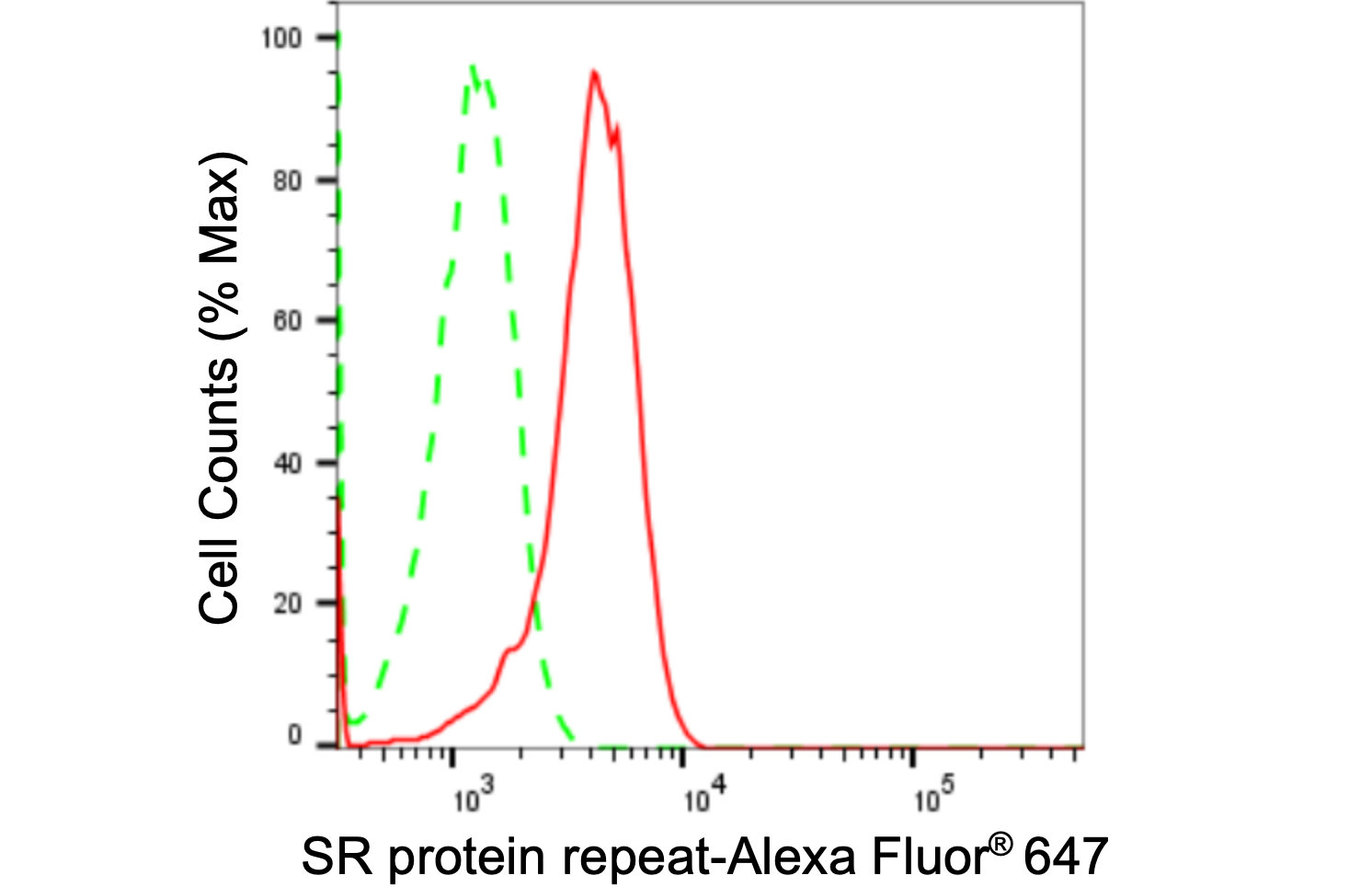 Flow cytometric analysis of SR protein repeat expression in HepG2 cells using SR protein repeat antibody. Green, isotype control; red, SR protein repeat.