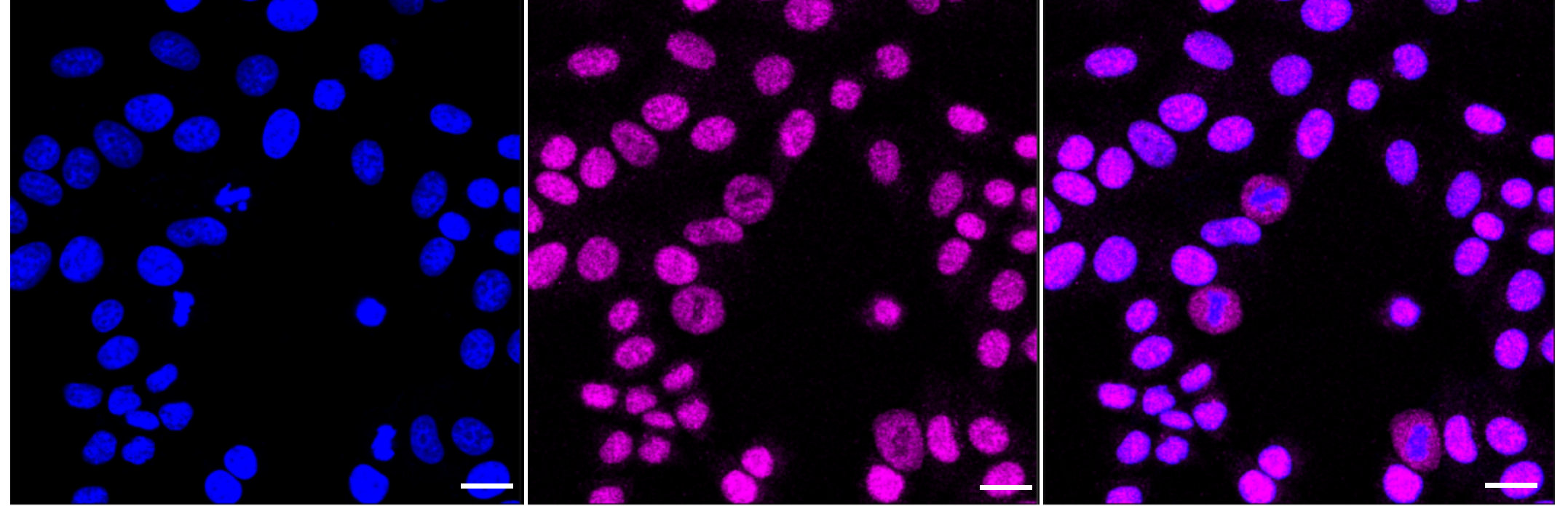 Immunocytochemical staining of HepG2 cells with SR protein repeat antibody. Nuclei were stained blue with DAPI; SR protein repeat was stained magenta with Alexa Fluor? 647. Images were taken using Leica stellaris 5. Protein abundance based on laser Intensity and smart gain: Medium. Scale bar: 20 μm.