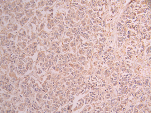 IHC image of CSB-RA116588A0HU diluted at 1:100 and staining in paraffin-embedded human breast cancer performed on a Leica BondTM system. After dewaxing and hydration, antigen retrieval was mediated by high pressure in a citrate buffer (pH 6.0). Section was blocked with 10% normal goat serum 30min at RT. Then primary antibody (1% BSA) was incubated at 4°C overnight. The primary is detected by a Goat anti-rabbit polymer IgG labeled by HRP and visualized using 0.05% DAB.