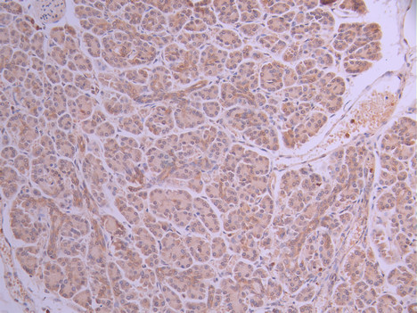 IHC image of CSB-RA116588A0HU diluted at 1:100 and staining in paraffin-embedded human pancreatic tissue performed on a Leica BondTM system. After dewaxing and hydration, antigen retrieval was mediated by high pressure in a citrate buffer (pH 6.0). Section was blocked with 10% normal goat serum 30min at RT. Then primary antibody (1% BSA) was incubated at 4°C overnight. The primary is detected by a Goat anti-rabbit polymer IgG labeled by HRP and visualized using 0.05% DAB.