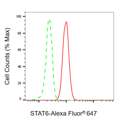 Flow cytometric analysis of STAT6 expression in HT-1080 cells using STAT6 antibody. Green, isotype control; red, STAT6.