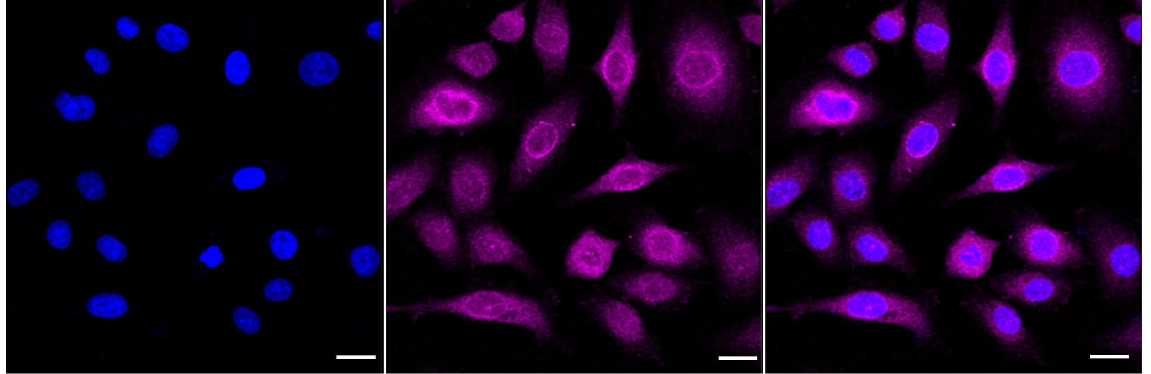 Immunocytochemical staining of HepG2 cells with STK3 antibody. Nuclei were stained blue with DAPI; STK3 was stained magenta with Alexa Fluor? 647. Images were taken using Leica stellaris 5. Protein abundance based on laser Intensity and smart gain: Medium. Scale bar: 20 μm.