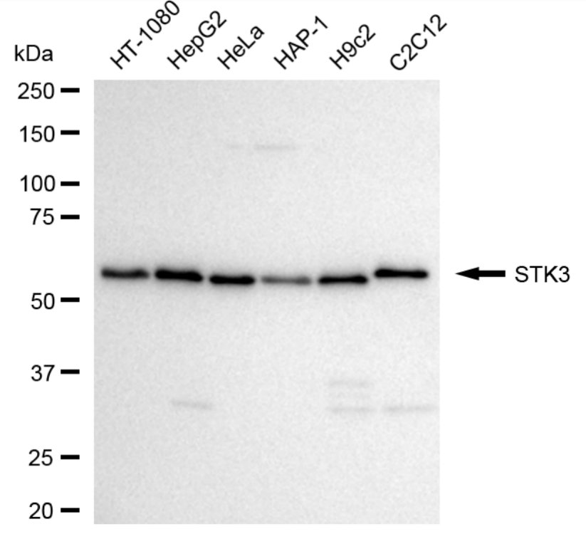 Western blotting analysis using STK3 antibody. Total cell lysates (30 μg) from various cell lines were loaded and separated by SDS-PAGE. The blot was incubated with STK3 antibody and HRP-conjugated goat anti-rabbit secondary antibody respectively.