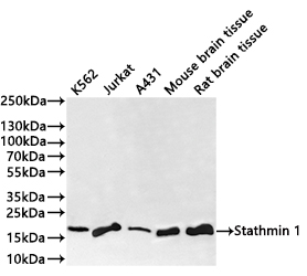 Positive WB detected in: K562 whole cell lysate(30μg), Jurkat whole cell lysate(30μg), A431 whole cell lysate(30μg), Mouse brain tissue lysate(20μg), Rat brain tissue lysate(20μg)