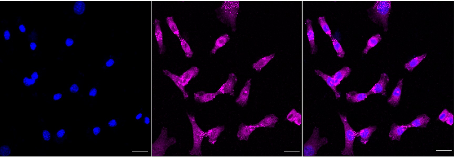 Immunocytochemical staining of C2C12 cells with STUB1 antibody. Nuclei were stained blue with DAPI; STUB1 was stained magenta with Alexa Fluor? 647. Images were taken using Leica stellaris 5. Protein abundance based on laser Intensity and smart gain: Medium. Scale bar, 20 μm.