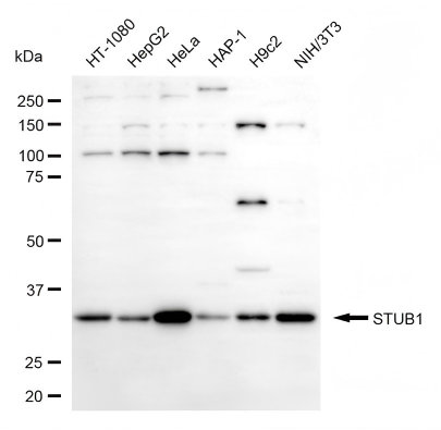 Western blotting analysis using STUB1 antibody. Total cell lysates (30 μg) from various cell lines were loaded and separated by SDS-PAGE. The blot was incubated with STUB1 antibody and HRP-conjugated goat anti-rabbit secondary antibody respectively.