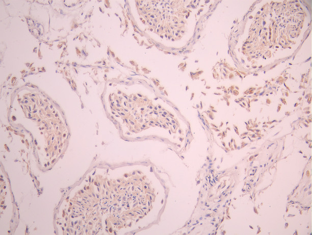 IHC image of CSB-RA027547A0HU diluted at 1:100 and staining in paraffin-embedded human testis tissue performed on a Leica BondTM system. After dewaxing and hydration, antigen retrieval was mediated by high pressure in a citrate buffer (pH 6.0). Section was blocked with 10% normal goat serum 30min at RT. Then primary antibody (1% BSA) was incubated at 4°C overnight. The primary is detected by a Goat anti-rabbit polymer IgG labeled by HRP and visualized using 0.05% DAB.
