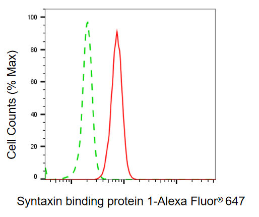Flow cytometric analysis of syntaxin binding protein 1 expression in C2C12 cells using syntaxin binding protein 1 antibody. Green, isotype control; red, syntaxin binding protein 1.
