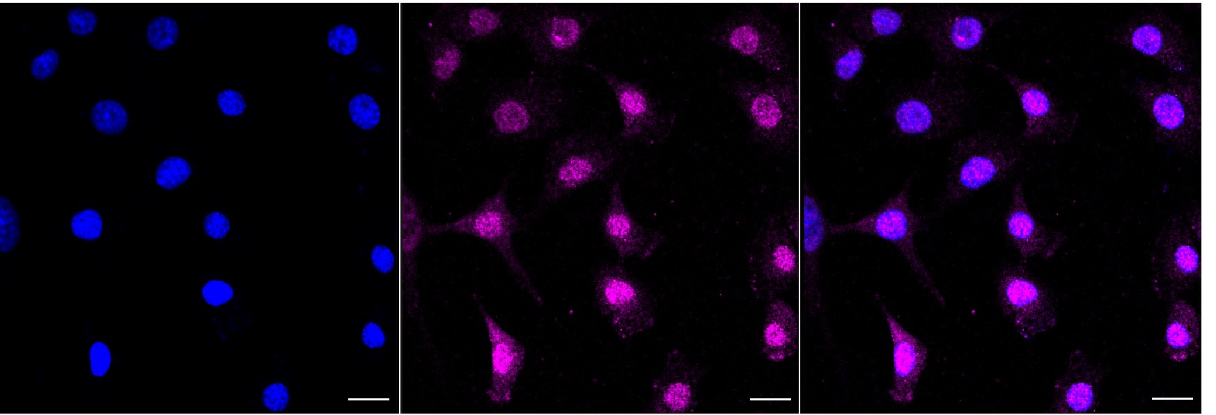 Immunocytochemical staining of C2C12 cells with Syntaxin binding protein 1 antibody. Nuclei were stained blue with DAPI; Syntaxin binding protein 1 was stained magenta with Alexa Fluor? 647. Images were taken using Leica stellaris 5. Protein abundance based on laser Intensity and smart gain: Medium. Scale bar, 20 μm.