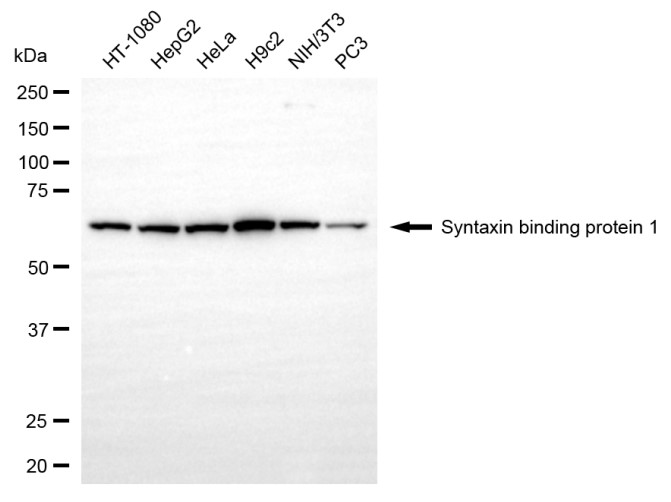 Western blotting analysis using syntaxin binding protein 1 antibody. Total cell lysates (30 μg) from various cell lines were loaded and separated by SDS-PAGE. The blot was incubated with syntaxin binding protein 1 antibody and HRP-conjugated goat anti-rabbit secondary antibody respectively.