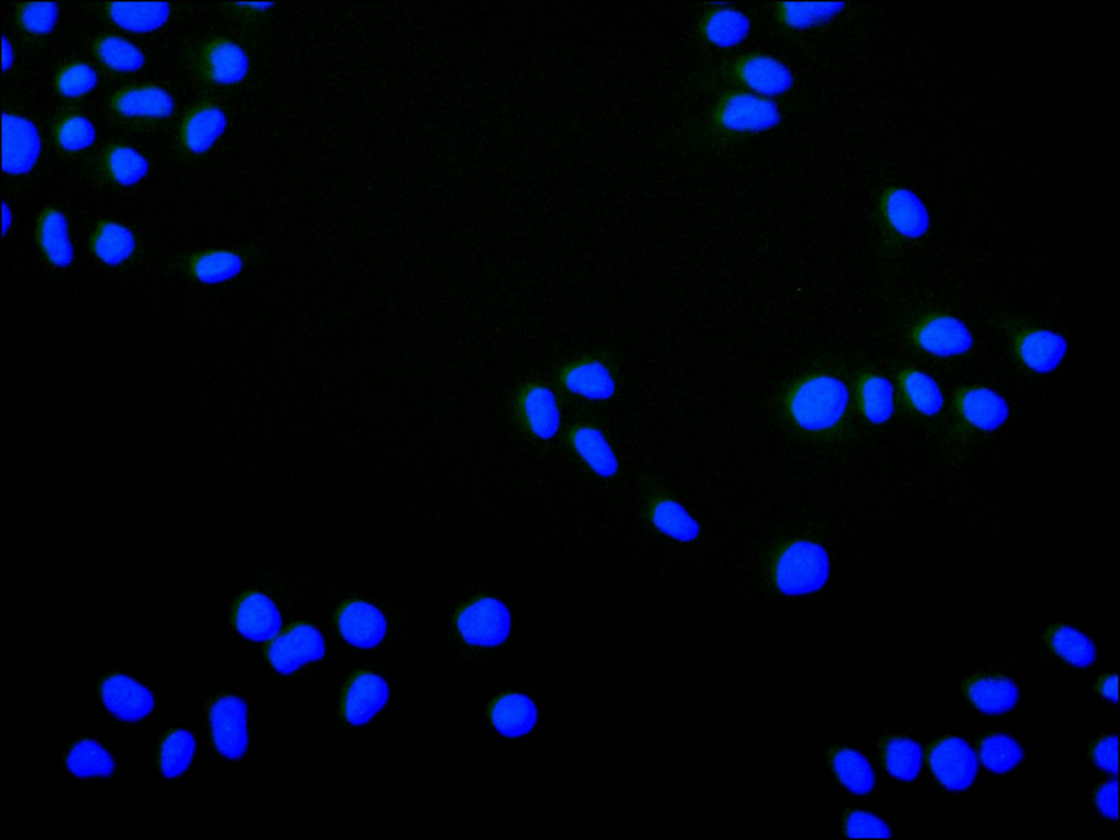 Immunofluorescence staining of HeLa cell with CSB-RA101412A0HU at 1:50 , counter-stained with DAPI. The cells were fixed in 4% formaldehyde, permeabilized using 0.2% Triton X-100 and blocked in 10% normal Goat Serum. The cells were then incubated with the antibody overnight at 4°C. The secondary antibody was Alexa Fluor 488-congugated AffiniPure Goat Anti-Rabbit IgG(H+L).