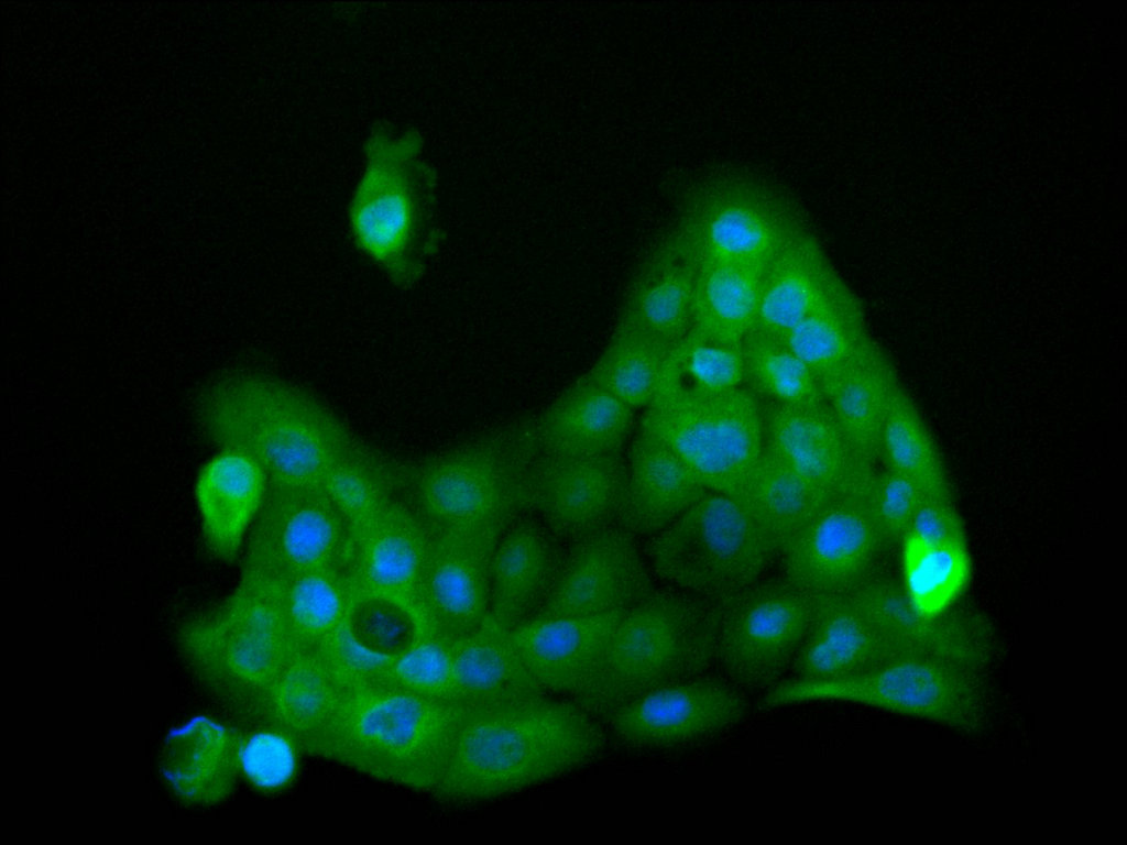 Immunofluorescence staining of A431 cell with CSB-RA599252A0HU at 1:50, counter-stained with DAPI. The cells were fixed in 4% formaldehyde, permeabilized using 0.2% Triton X-100 and blocked in 10% normal Goat Serum. The cells were then incubated with the antibody overnight at 4°C. The secondary antibody was Alexa Fluor 488-congugated AffiniPure Goat Anti-Rabbit IgG(H+L).