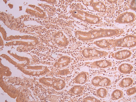 IHC image of CSB-RA599252A0HU diluted at 1:100 and staining in paraffin-embedded human small intestine tissue performed on a Leica BondTM system. After dewaxing and hydration, antigen retrieval was mediated by high pressure in a citrate buffer (pH 6.0). Section was blocked with 10% normal goat serum 30min at RT. Then primary antibody (1% BSA) was incubated at 4°C overnight. The primary is detected by a Goat anti-rabbit polymer IgG labeled by HRP and visualized using 0.05% DAB.