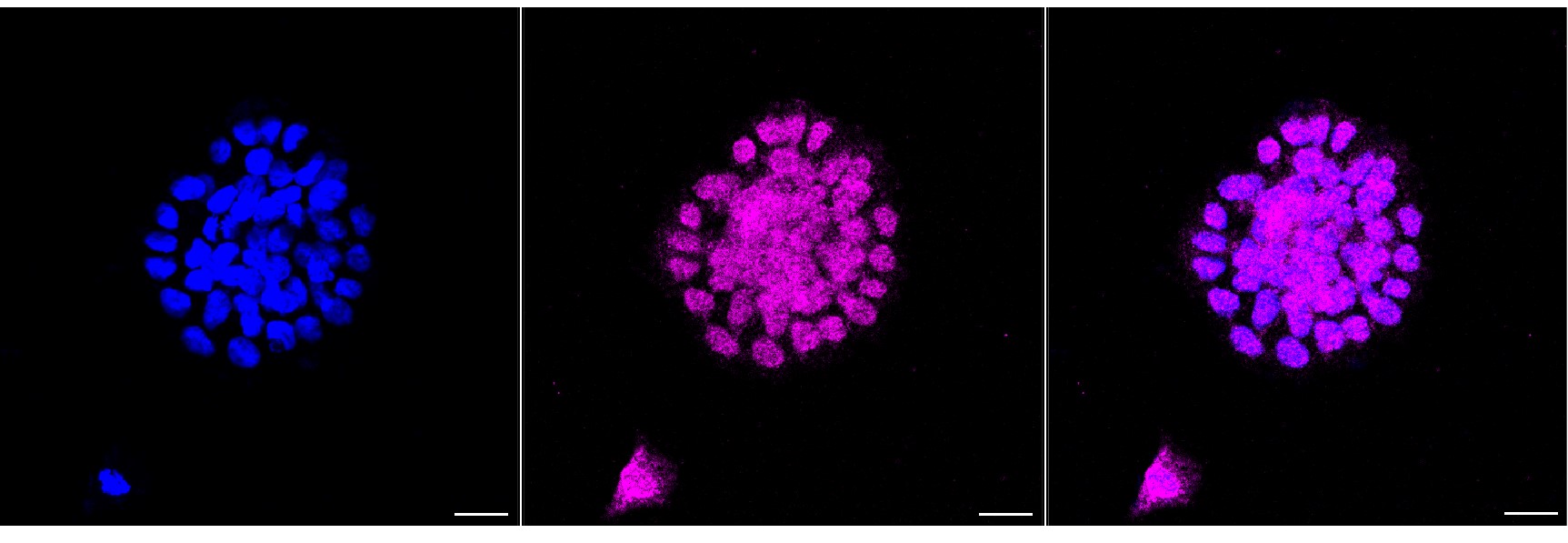Immunocytochemical staining of HAP-1 cells with Nesprin3?antibody. Nuclei were stained blue with DAPI; Nesprin3?was stained magenta with Alexa Fluor? 647. Images were taken using Leica stellaris 5. Protein abundance based on laser Intensity and smart gain: Low. Scale bar, 20 μm.