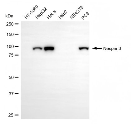 Western blotting analysis using nesprin3 antibody. Total cell lysates (30 μg) from various cell lines were loaded and separated by SDS-PAGE. The blot was incubated with nesprin3 antibody and HRP-conjugated goat anti-rabbit secondary antibody respectively.