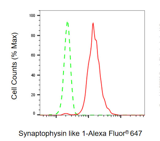 Flow cytometric analysis of Synaptophysin like 1 expression in HeLa cells using Synaptophysin like 1 antibody. Green, isotype control; red, Synaptophysin like 1.