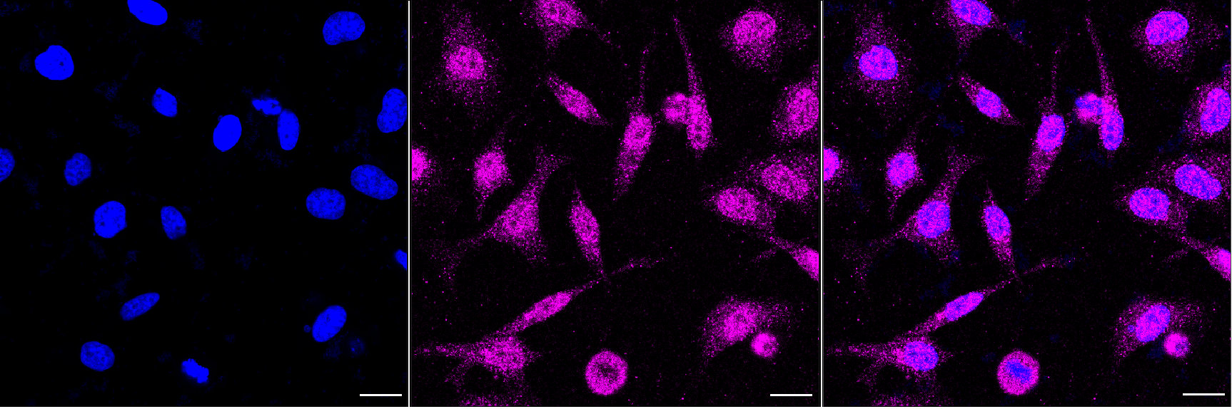 Immunocytochemical staining of HeLa cells with Synaptophysin like 1 antibody. Nuclei were stained blue with DAPI;Synaptophysin like 1 was stained magenta with Alexa Fluor? 647. Images were taken using Leica stellaris 5. Protein abundance based on laser Intensity and smart gain: Medium. Scale bar, 20 μm.
