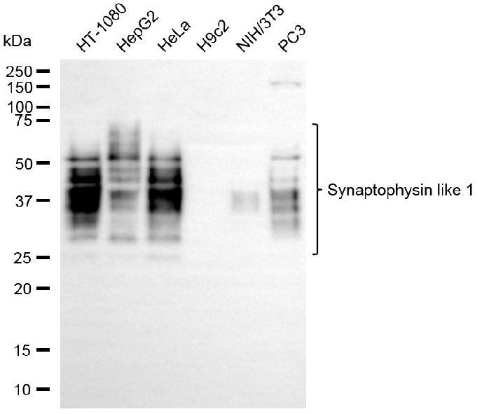 Western blotting analysis using synaptophysin like 1 antibody. Total cell lysates (30 μg) from various cell lines were loaded and separated by SDS-PAGE. The blot was incubated with synaptophysin like 1 antibody and HRP-conjugated goat anti-rabbit secondary antibody respectively.