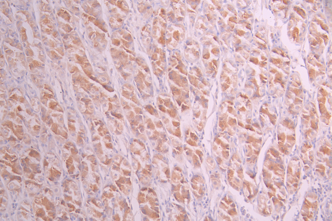 IHC image of CSB-RA243394A0HU diluted at 1:100 and staining in paraffin-embedded human stomach tissue performed on a Leica BondTM system. After dewaxing and hydration, antigen retrieval was mediated by high pressure in a citrate buffer (pH 6.0). Section was blocked with 10% normal goat serum 30min at RT. Then primary antibody (1% BSA) was incubated at 4°C overnight. The primary is detected by a Goat anti-rabbit polymer IgG labeled by HRP and visualized using 0.05% DAB.