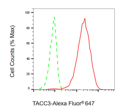 Flow cytometric analysis of TACC3 expression in HAP-1 cells using TACC3 antibody. Green, isotype control; red, TACC3.