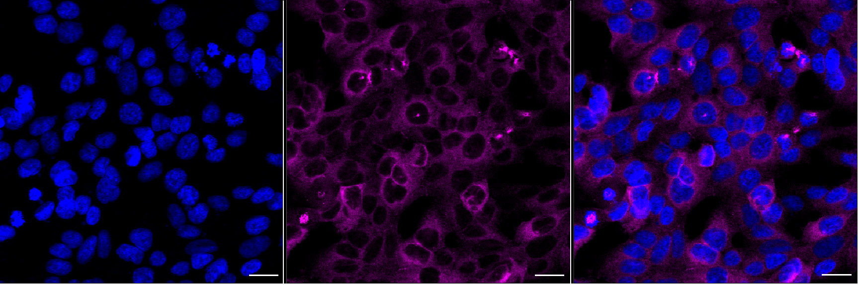 Immunocytochemical staining of HAP-1 cells with TACC3 antibody.Nuclei were stained blue with DAPI; TACC3 was stained magenta with Alexa Fluor? 647. Images were taken using Leica stellaris 5. Protein abundance based on laser Intensity and Smart Gain:Medium. Scale bar, 20 μm.