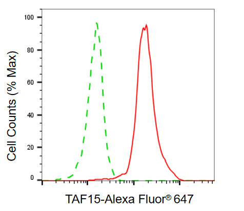 Flow cytometric analysis of TAF15 expression in HepG2 cells using TAF15 antibody. Green, isotype control; red, TAF15.