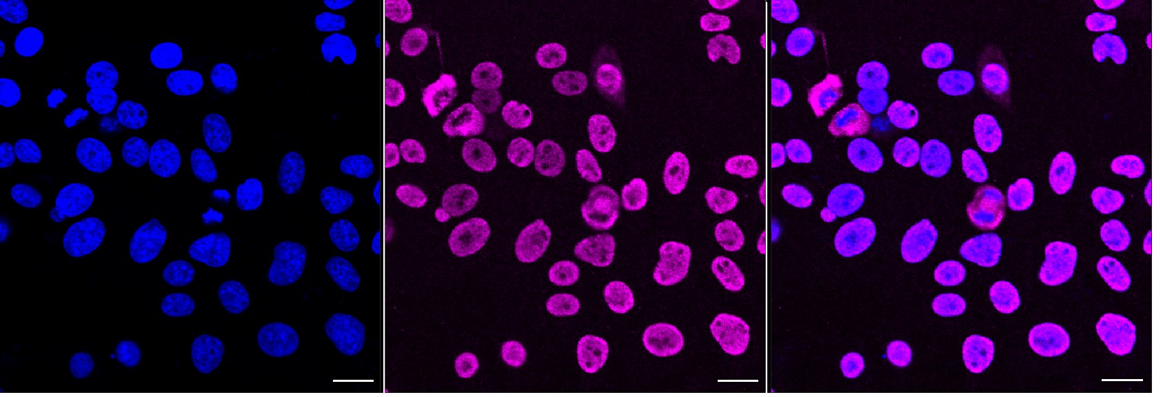 Immunocytochemical staining of HepG2 cells with TAF15 antibody. Nuclei were stained blue with DAPI; TAF15 was stained magenta with Alexa Fluor? 647. Images were taken using Leica stellaris 5. Protein abundance based on laser Intensity and smart gain: Medium. Scale bar, 20 μm.