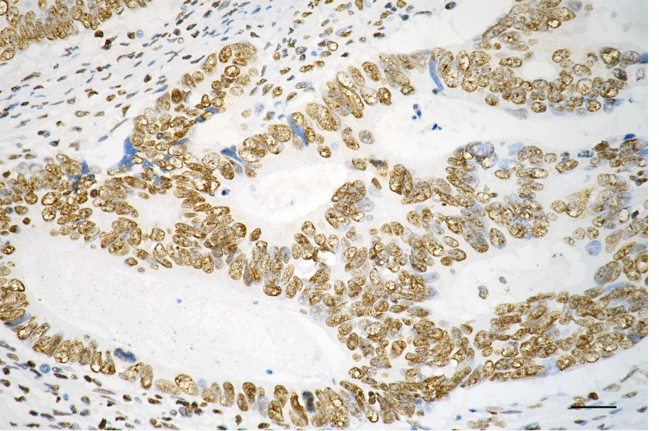 Immunohistochemistry was performed on paraffin-embedded human sigmoid colon carcinoma using TAF15 antibody. Antigen retrieval was done in sodium citrate buffer (pH 6.0). DAB was used for detection, with hematoxylin counterstaining. Images were acquired using a Nikon Ci-L Plus microscope (40× objective). Scale bar: 25 μm.