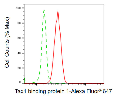 Flow cytometric analysis of tax1 binding protein 1 expression in C2C12 cells using tax1 binding protein 1 antibody. Green, isotype control; red, tax1 binding protein 1.