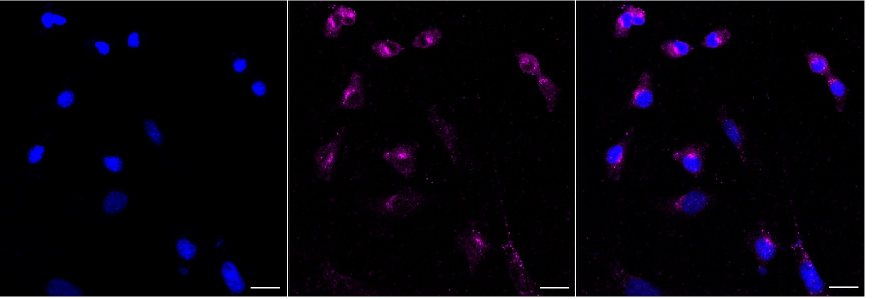 Immunocytochemical staining of C2C12 cells with Tax1 binding protein 1 antibody. Nuclei were stained blue with DAPI; Tax1 binding protein 1 was stained magenta with Alexa Fluor? 647. Images were taken using Leica stellaris 5. Protein abundance based on laser Intensity and smart gain: Medium. Scale bar, 20 μm.