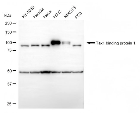 Western blotting analysis using tax1 binding protein 1 antibody. Total cell lysates (30 μg) from various cell lines were loaded and separated by SDS-PAGE. The blot was incubated with tax1 binding protein 1 antibody and HRP-conjugated goat anti-rabbit secondary antibody respectively.