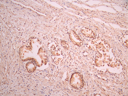 IHC image of CSB-RA782443A0HU diluted at 1:100 and staining in paraffin-embedded human prostate tissue performed on a Leica BondTM system. After dewaxing and hydration, antigen retrieval was mediated by high pressure in a citrate buffer (pH 6.0). Section was blocked with 10% normal goat serum 30min at RT. Then primary antibody (1% BSA) was incubated at 4°C overnight. The primary is detected by a Goat anti-rabbit polymer IgG labeled by HRP and visualized using 0.05% DAB.