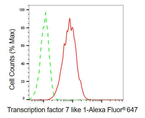 Flow cytometric analysis of transcription factor 7 like 1 expression in HT-1080 cells using transcription factor 7 like 1 antibody. Green, isotype control; red, transcription factor 7 like 1.