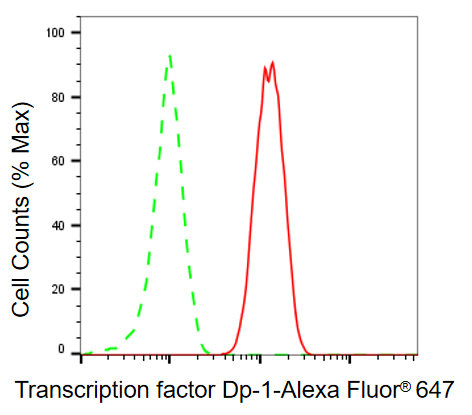 Flow cytometric analysis of transcription factor Dp-1 expression in C2C12 cells using transcription factor Dp-1 antibody. Green, isotype control; red, transcription factor Dp-1.