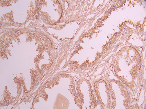 IHC image of CSB-RA581235A0HU diluted at 1:100 and staining in paraffin-embedded human prostate cancer performed on a Leica BondTM system. After dewaxing and hydration, antigen retrieval was mediated by high pressure in a citrate buffer (pH 6.0). Section was blocked with 10% normal goat serum 30min at RT. Then primary antibody (1% BSA) was incubated at 4°C overnight. The primary is detected by a Goat anti-rabbit polymer IgG labeled by HRP and visualized using 0.05% DAB.