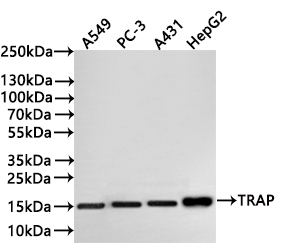 Positive WB detected in: A549 whole cell lysate(30μg), PC-3 whole cell lysate(30μg), A431 whole cell lysate(30μg), HepG2 whole cell lysate(30μg)
