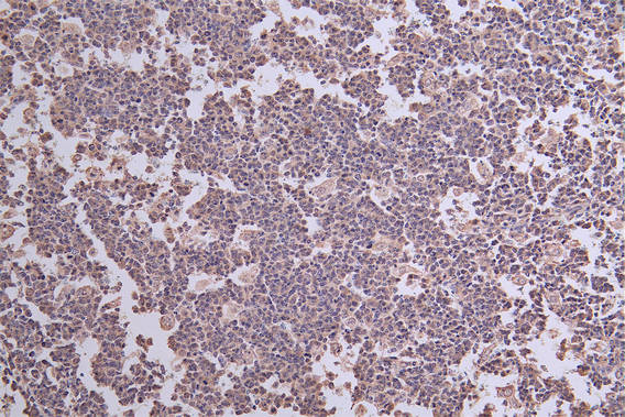 IHC image of CSB-RA262013A0HU diluted at 1:50 and staining in paraffin-embedded human tonsil tissue performed on a Leica BondTM system. After dewaxing and hydration, antigen retrieval was mediated by high pressure in a citrate buffer (pH 6.0). Section was blocked with 10% normal goat serum 30min at RT. Then primary antibody (1% BSA) was incubated at 4°C overnight. The primary is detected by a Goat anti-rabbit polymer IgG labeled by HRP and visualized using 0.30% DAB.
