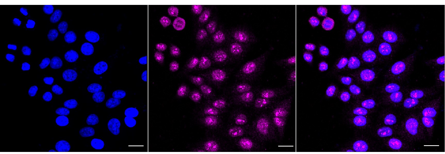 Immunocytochemical staining of HepG2 cells with THO complex subunit 1 antibody. Nuclei were stained blue with DAPI; THO complex subunit 1 was stained magenta with Alexa Fluor? 647. Images were taken using Leica stellaris 5. Protein abundance based on laser Intensity and smart gain: Medium. Scale bar, 20 μm.