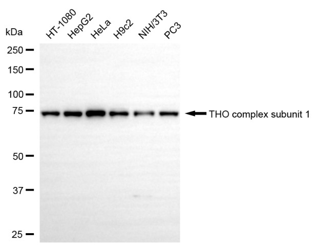 Western blotting analysis using THO complex subunit 1 antibody. Total cell lysates (30 μg) from various cell lines were loaded and separated by SDS-PAGE. The blot was incubated with THO complex subunit 1 antibody and HRP-conjugated goat anti-rabbit secondary antibody respectively.