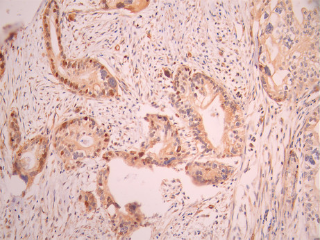 IHC image of CSB-RA031794A0HU diluted at 1:100 and staining in paraffin-embedded human pancreatic cancer performed on a Leica BondTM system. After dewaxing and hydration, antigen retrieval was mediated by high pressure in a citrate buffer (pH 6.0). Section was blocked with 10% normal goat serum 30min at RT. Then primary antibody (1% BSA) was incubated at 4°C overnight. The primary is detected by a Goat anti-rabbit polymer IgG labeled by HRP and visualized using 0.05% DAB.