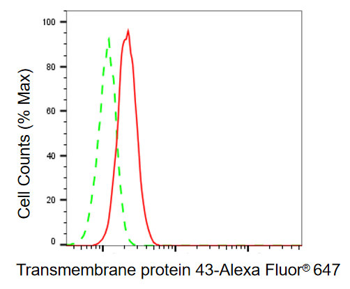 Flow cytometric analysis of transmembrane protein 43 expression in C2C12 cells using transmembrane protein 43 antibody. Green, isotype control; red, transmembrane protein 43.