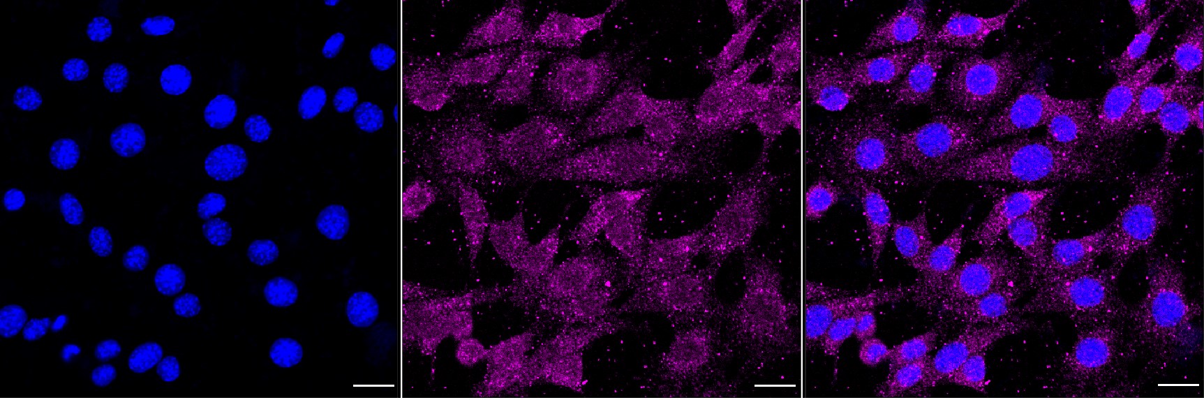 Immunocytochemical staining of C2C12 cells with Transmembrane protein 43 antibody. Nuclei were stained blue with DAPI; Transmembrane protein 43 was stained magenta with Alexa Fluor? 647. Images were taken using Leica stellaris 5. Protein abundance based on laser Intensity and smart gain: Medium. Scale bar, 20 μm.