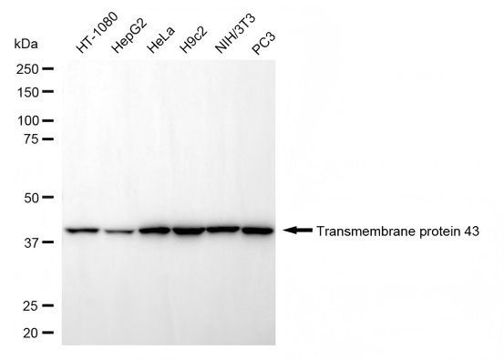 Western blotting analysis using transmembrane protein 43 antibody. Total cell lysates (30 μg) from various cell lines were loaded and separated by SDS-PAGE. The blot was incubated with transmembrane protein 43 antibody and HRP-conjugated goat anti-rabbit secondary antibody respectively.