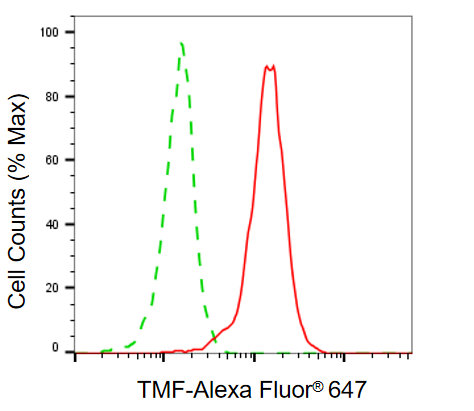 Flow cytometric analysis of TMF expression in HepG2 cells using TMF antibody. Green, isotype control; red, TMF.