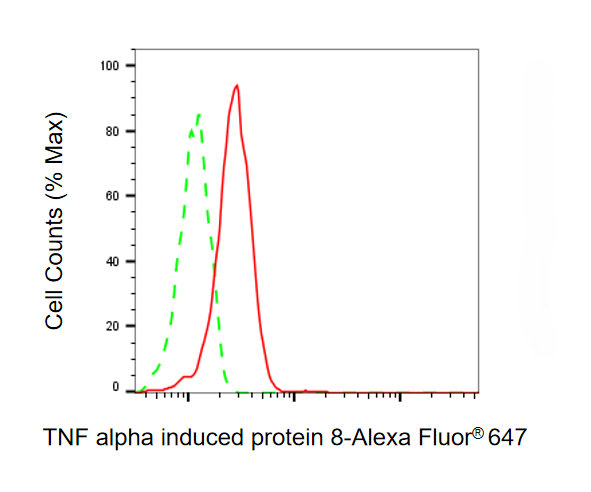 Flow cytometric analysis of TNF alpha induced protein 8 expression in HeLa cells using TNF alpha induced protein 8 antibody. Green, isotype control; red, TNF alpha induced protein 8.
