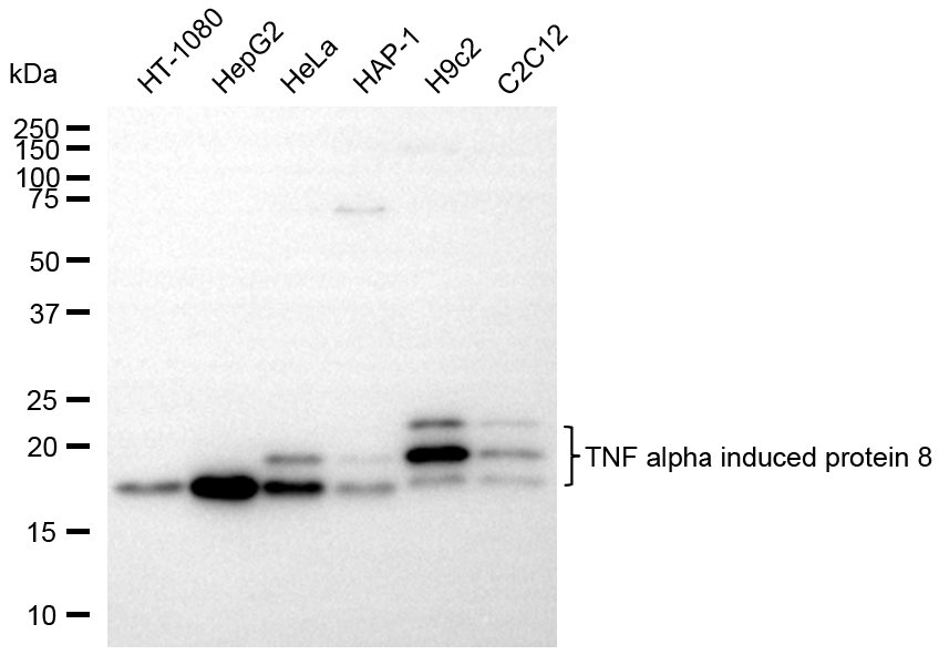 Western blotting analysis using TNF alpha induced protein 8 antibody. Total cell lysates (30 μg) from various cell lines were loaded and separated by SDS-PAGE. The blot was incubated with TNF alpha induced protein 8 antibody and HRP-conjugated goat anti-rabbit secondary antibody respectively.